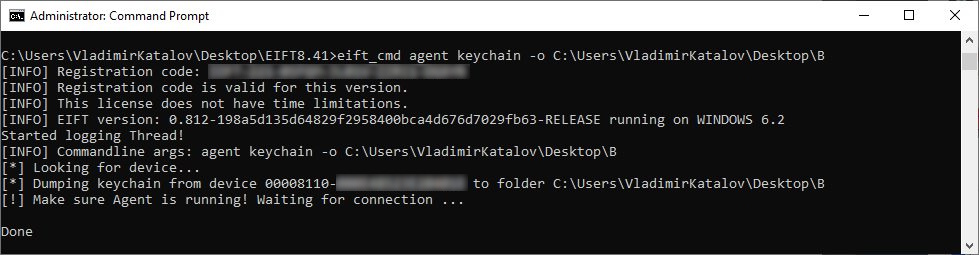 If the device is configured to produce password-protected backups, experts must use Elcomsoft Phone Breaker to recover the password and remove encryption. If no backup password is set, the tool will automatically configure the system with a temporary password (“123”) in order to be able to decrypt keychain items (password will be reset after the acquisition).