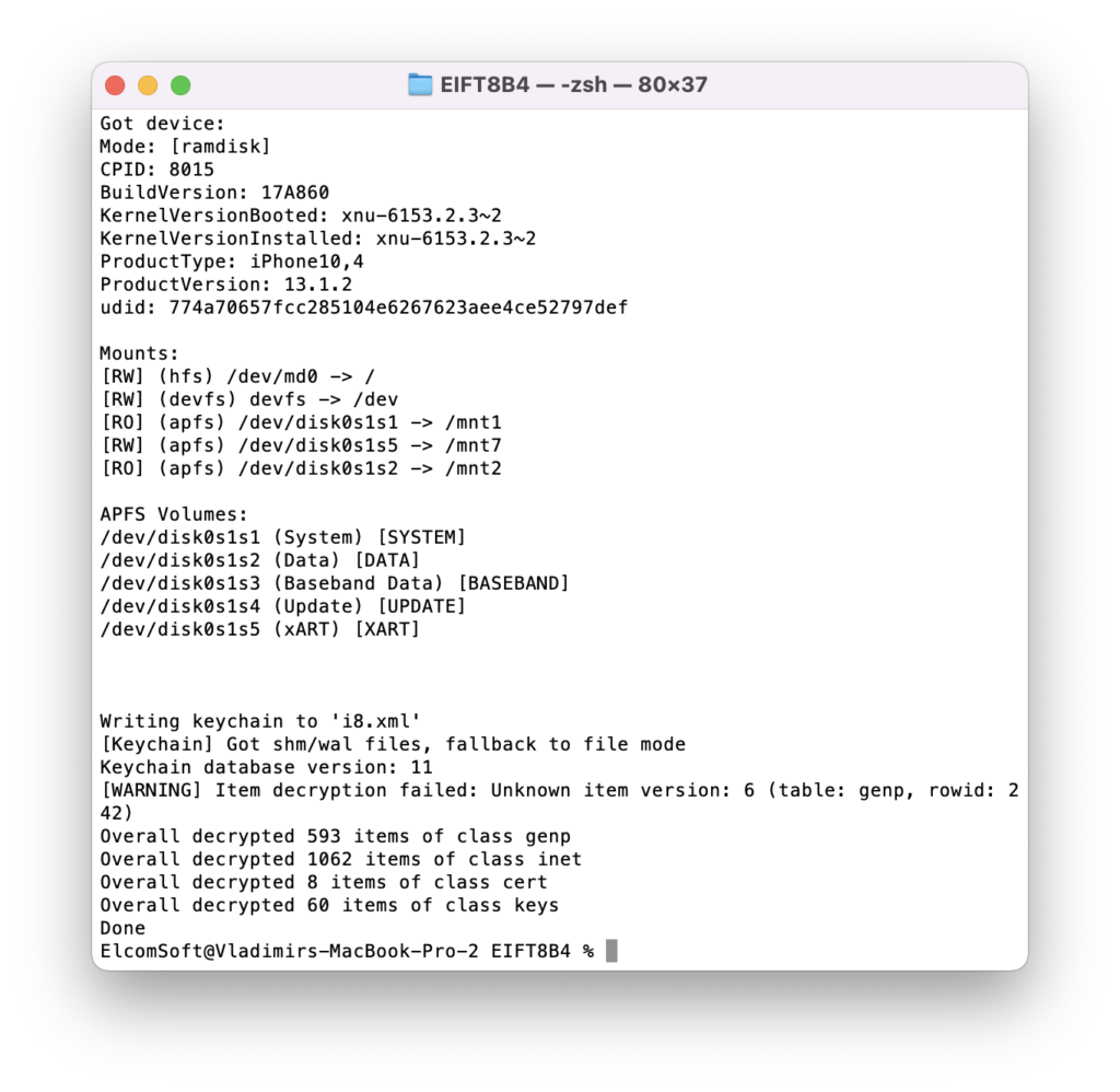 Perform physical and logical acquisition of iPhone, iPad and iPod Touch devices. Image device file system, extract device secrets (passwords, encryption keys and protected data) and decrypt the file system image.