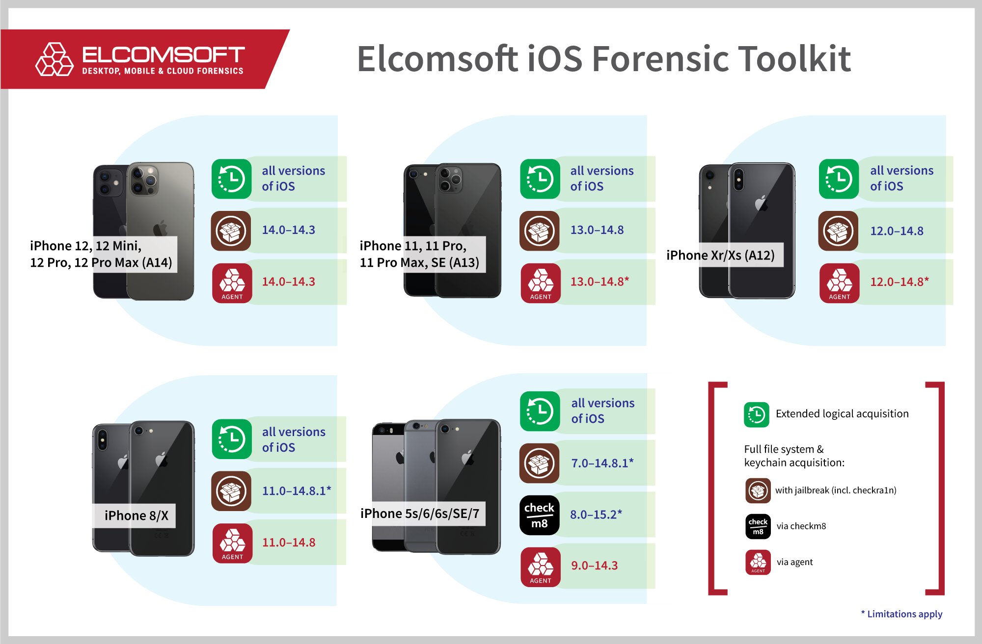 Elcomsoft iOS Forensic Toolkit 7.10 brings low-level file system extraction support for three generations of Apple devices based on the A11, A12, and A13 Bionic platforms. For these devices, the updated toolkit now covers the entire range of iOS releases since iOS 9.0 all the way up to iOS 14.8 with no gaps or exclusions. All 64-bit iPhone models based on the A11 through A13 generations SoC are supported, including the iPhone 8/8 Plus, iPhone X, Xr, Xs, Xs Max, as well as the entire iPhone 11 generation and the iPhone SE (2nd gen).