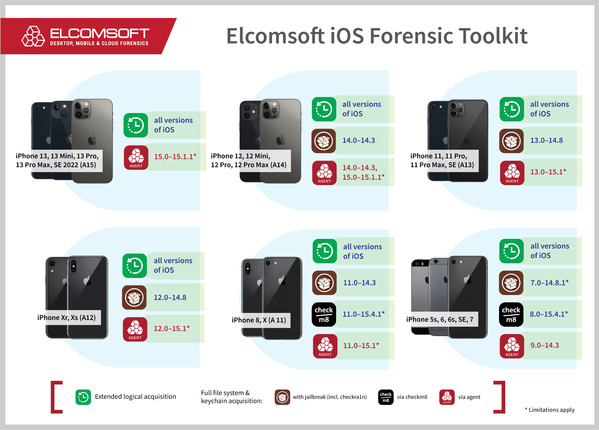 Elcomsoft iOS Forensic Toolkit 7.30 brings the ability to perform low-level file system extraction for iPhone models up to the iPhone 13 Pro Max running iOS 15.1.1. The still-in-beta iOS Forensic Toolkit 8.0 receives the same features, and adds checkm8 acquisition support for iPhone 6s, SE, 7, 8, and iPhone X devices running iOS 15.4 and iOS 15.4.1.